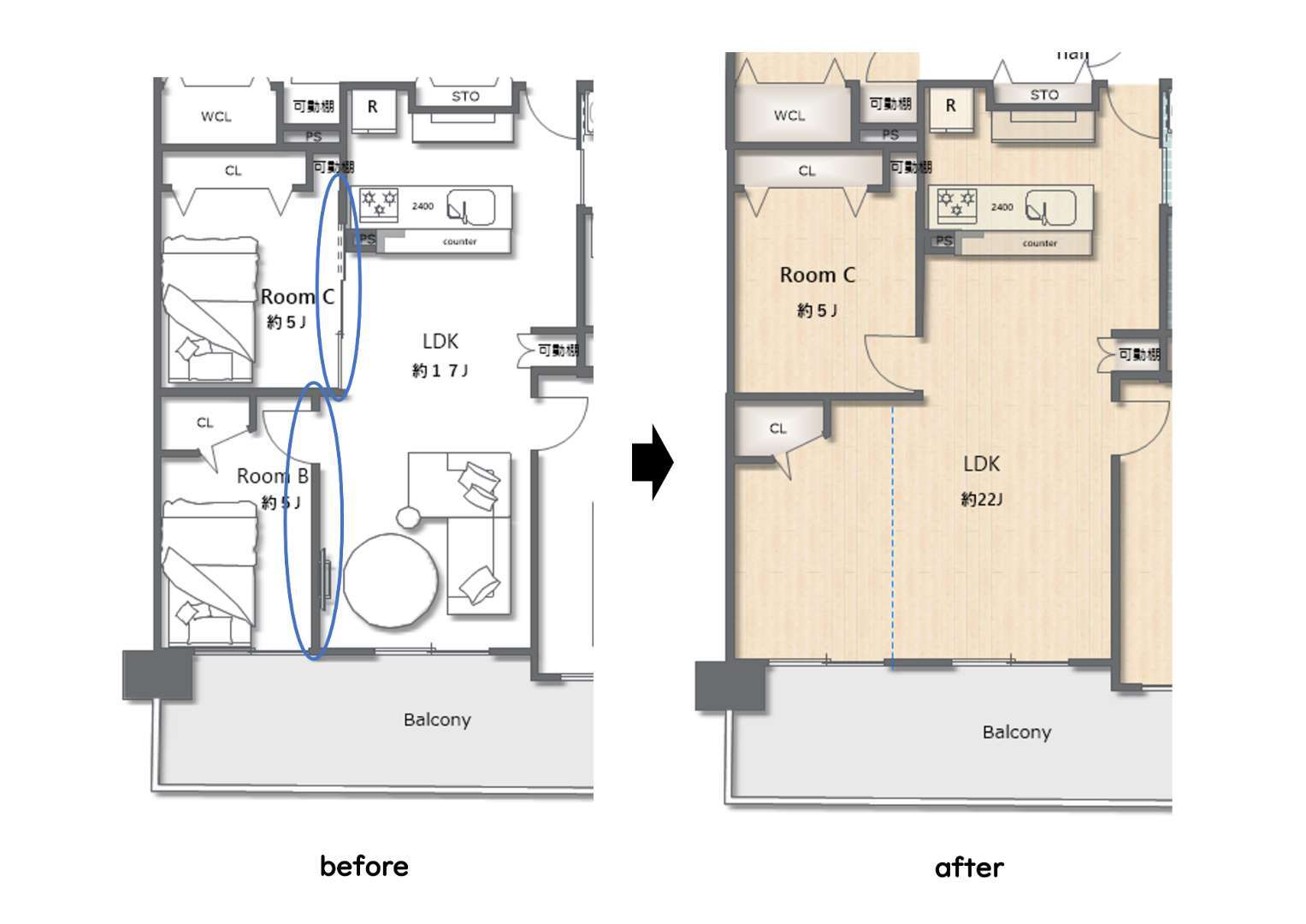 ・間仕切り壁を撤去し、LDKと洋室を一体化