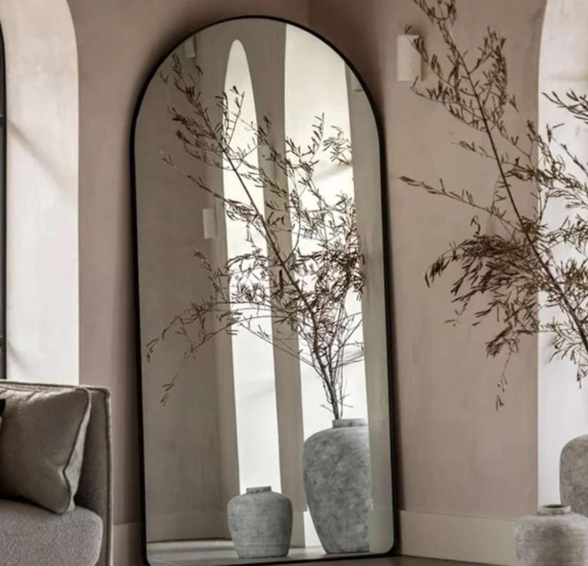 シャープな直線よりも、カーブしたソファ・円形テーブルアーチ型開口・