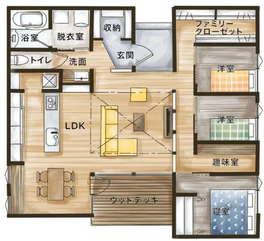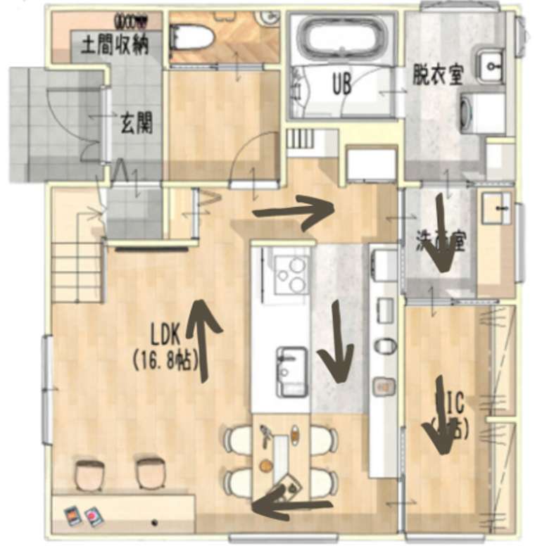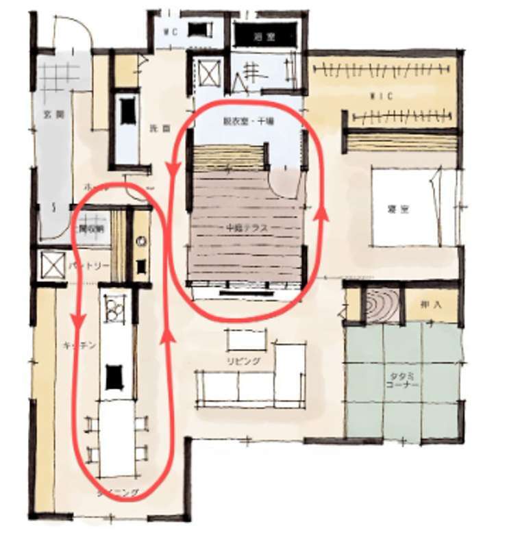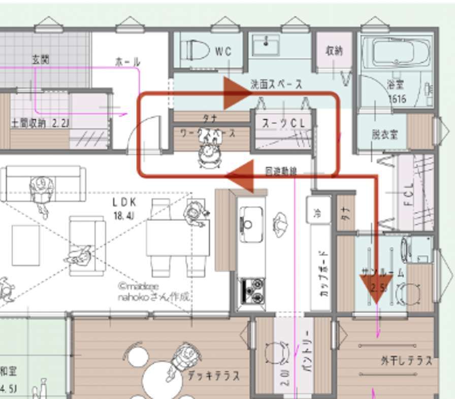 回遊動線や玄関直行動線と組み合わせることで、完成度がさらに高まります。